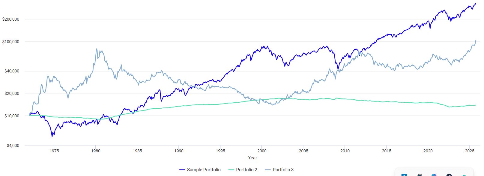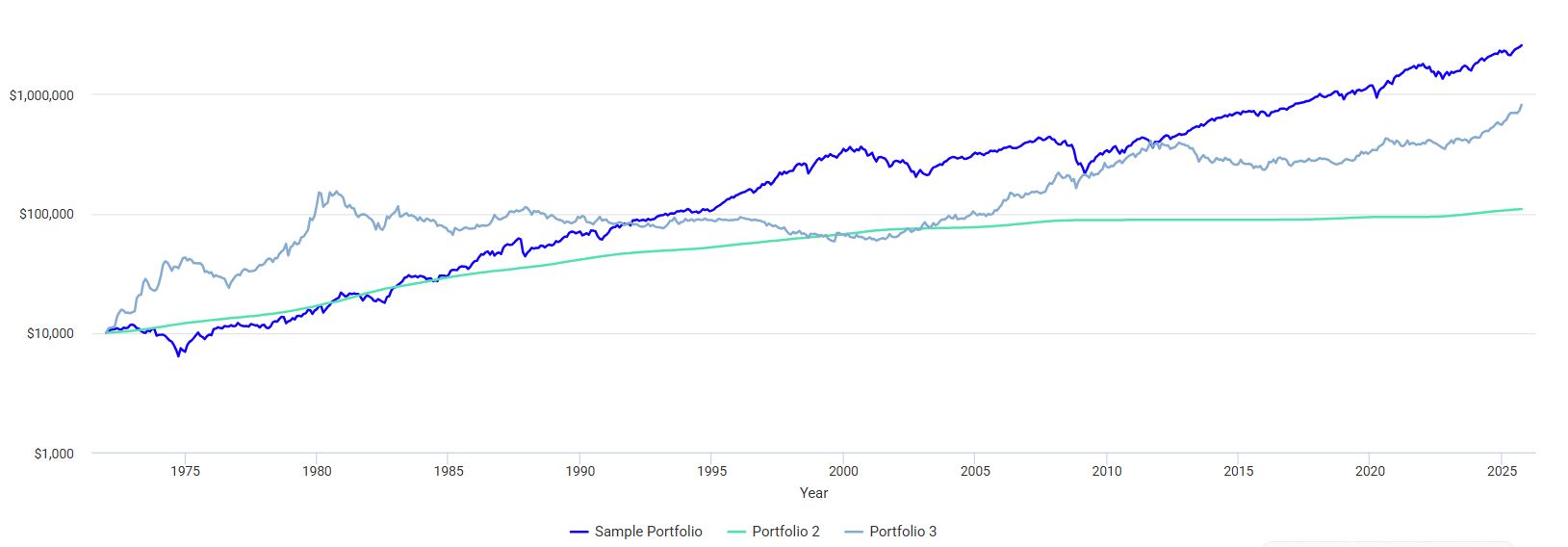 それぞれ1972年に投資したら、どのような値動きになったか?のチャートです。